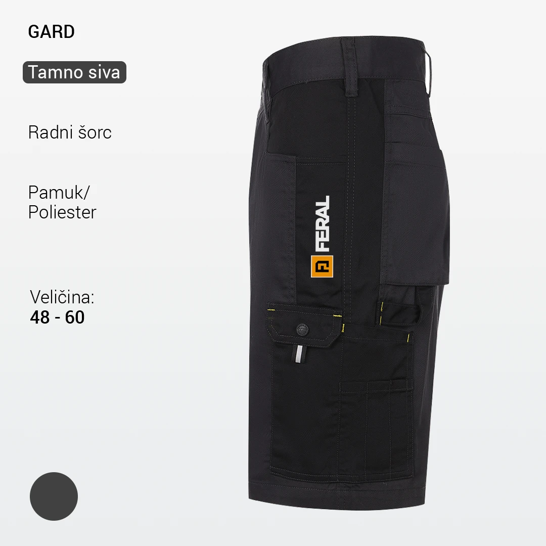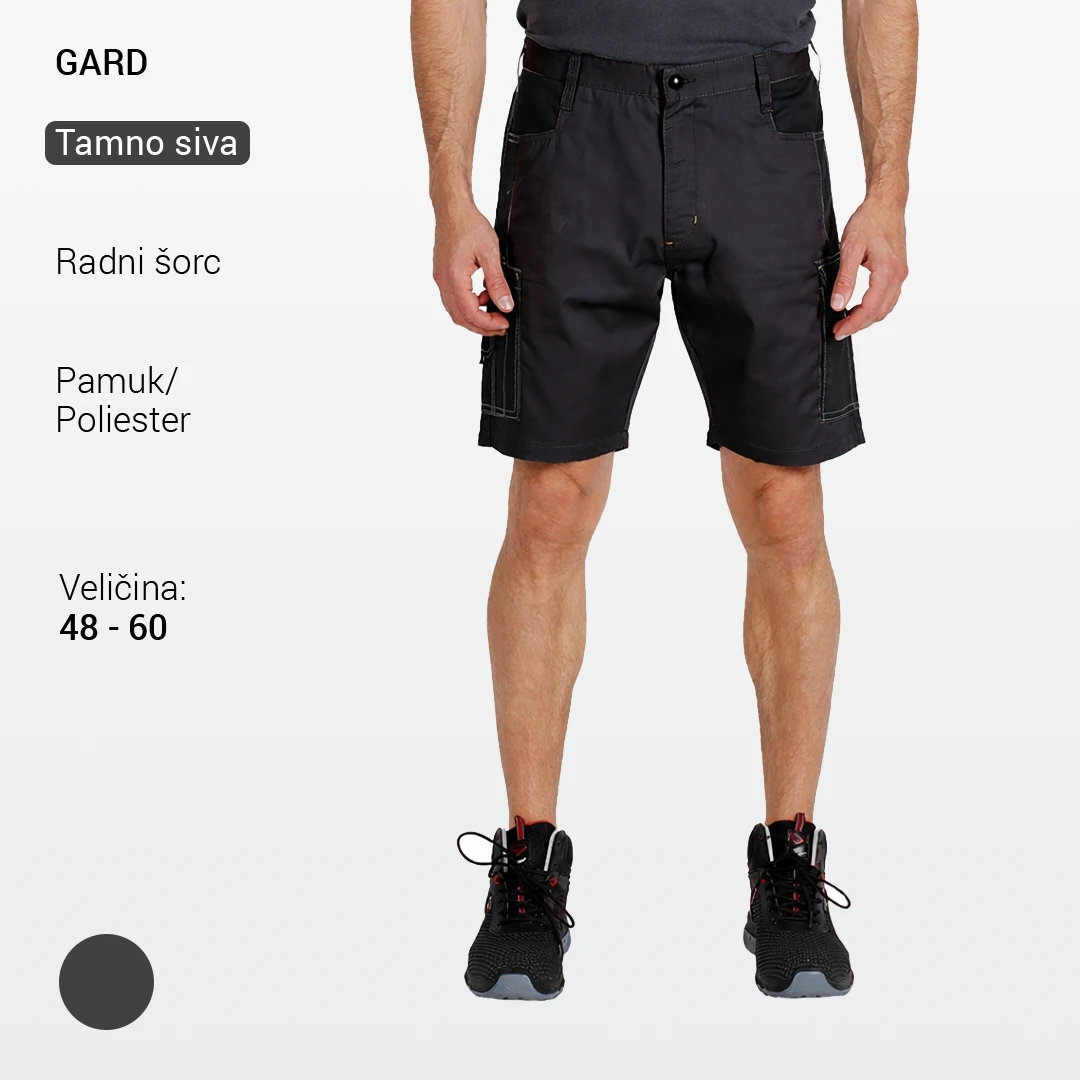 Materijal je prilagođen svakodnevnoj upotrebi u radnim okruženjima, uz dovoljnu čvrstoću za intenzivniji rad i prijatan osećaj pri nošenju. Model je opremljen sa dva prednja džepa, dva zadnja džepa i dva bočna multifunkcionalna džepa na nogavicama, koji omogućavaju praktično odlaganje alata i dodatne opreme tokom rada. Konstrukcija je jednostavna i funkcionalna, sa ojačanim štepovima na kritičnim mestima radi smanjenja habanja i produženja veka trajanja proizvoda. GARD BERMUDA su namenjene za rad u skladištima, logistici, servisima, održavanju i lakšoj industriji, posebno u uslovima gde su potrebni udobnost, funkcionalni džepovi i sloboda kretanja.