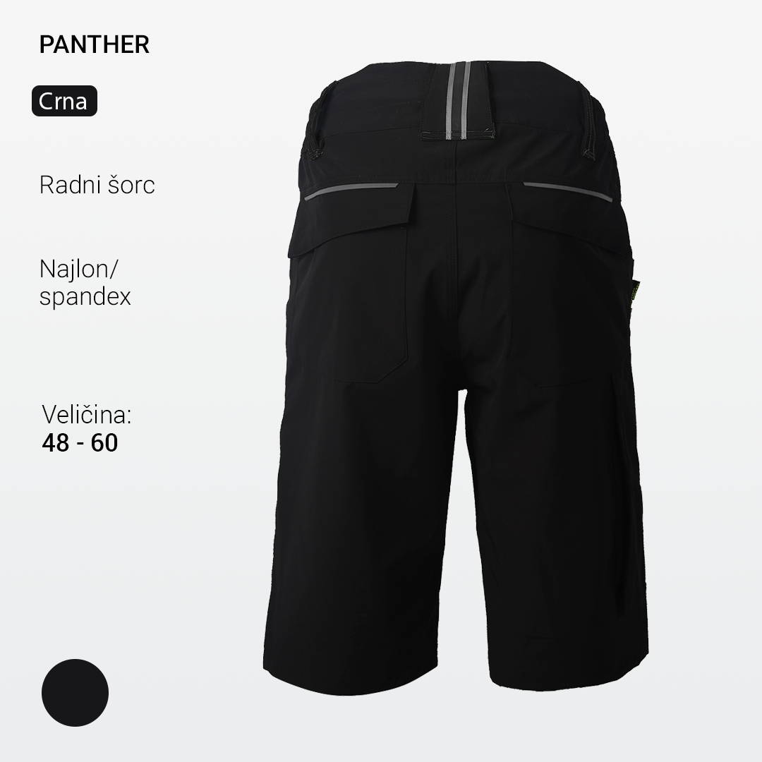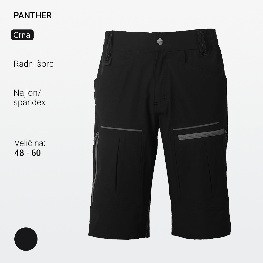 Radne bermude PANTHER pripadaju premium liniji profesionalne radne odeće, razvijenoj za korisnike koji zahtevaju viši nivo udobnosti, kvaliteta izrade i funkcionalnosti tokom rada u toplijim uslovima. Izrađene su od lagane, elastične 4-way stretch tkanine na bazi najlona, koja omogućava potpunu slobodu pokreta i visok komfor pri dugotrajnom nošenju. Materijal je glatke i kompaktne strukture, sa izraženim tehničkim izgledom karakterističnim za savremenu premium radnu odeću.